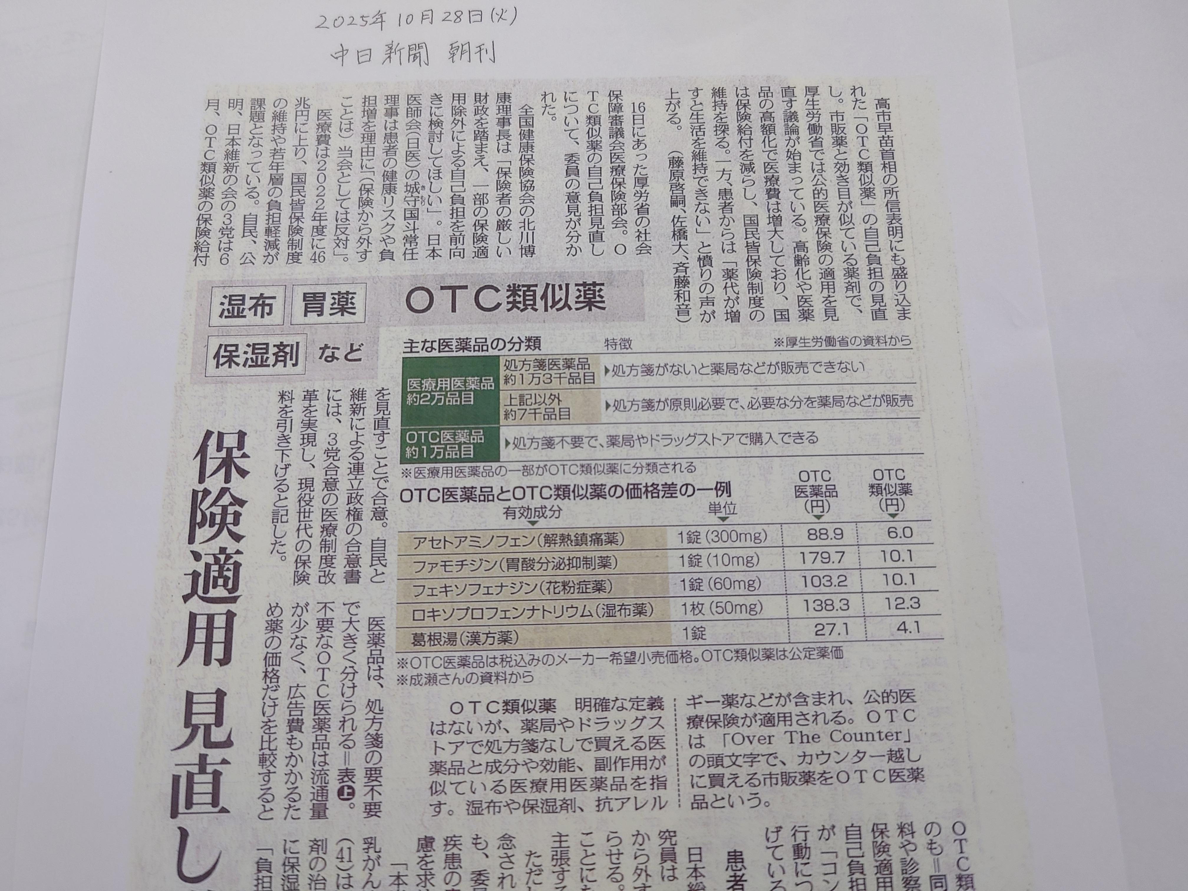 高市早苗首相の所信表明にも盛り込まれた「OTC類似薬」の自己負担の見直し。厚労省で議論が始まっていますが(一昨日の中日新聞にも記事が掲載)。...医療財政がひっ迫する中での議論。保険適用で患者は1~3割負担で済むことによる「コンビニ受診」指摘。一方で「保険適用外は20~60代の現役世代の負担増になる」との反対意見。