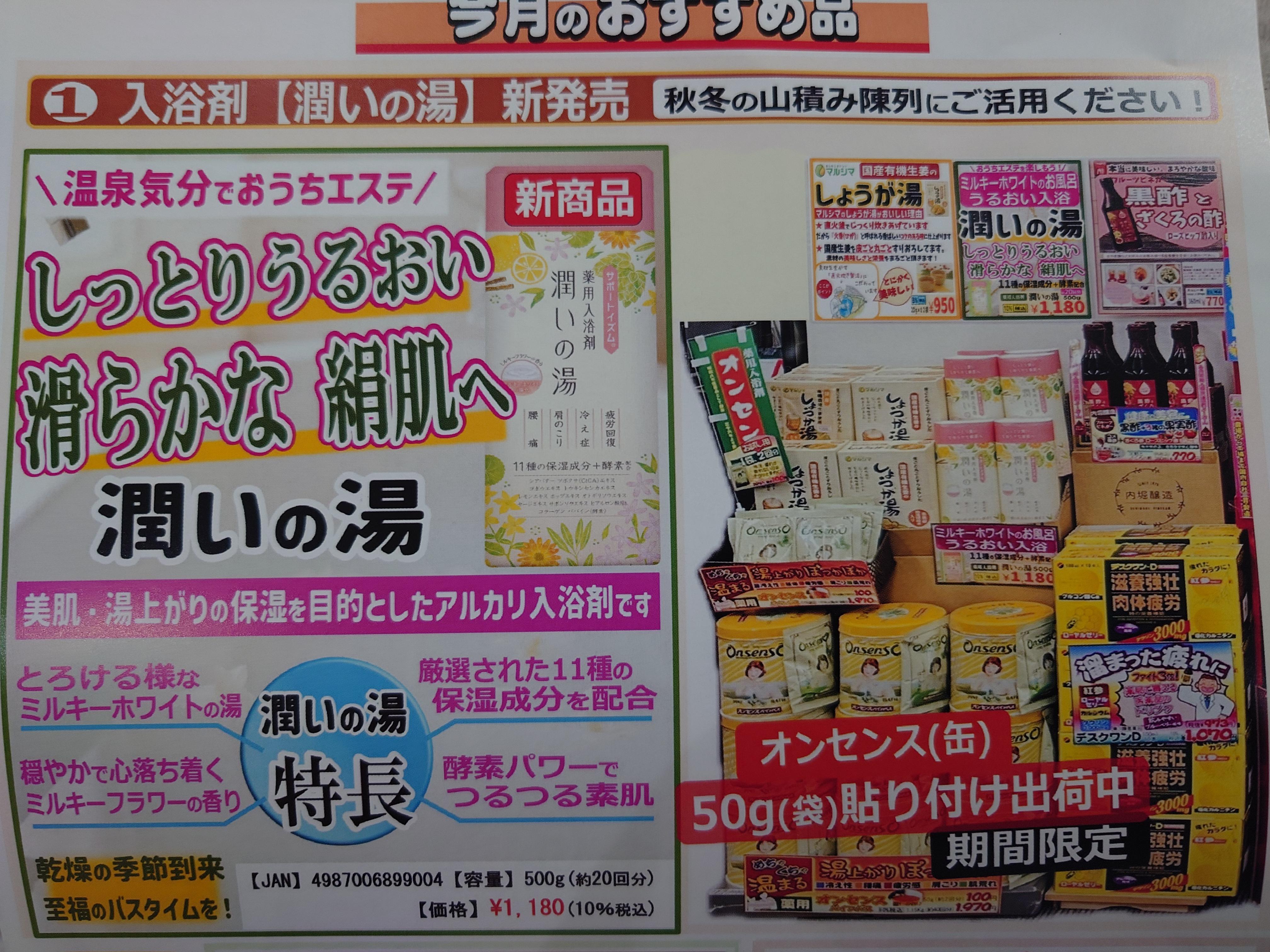 ★気になるこの時期の商品を山積み陳列!...ロングセラー【オンセンス】に加え、今月新発売の美肌・湯上りの保湿を目的とした【潤いの湯】、国産有機生姜【しょうが湯】